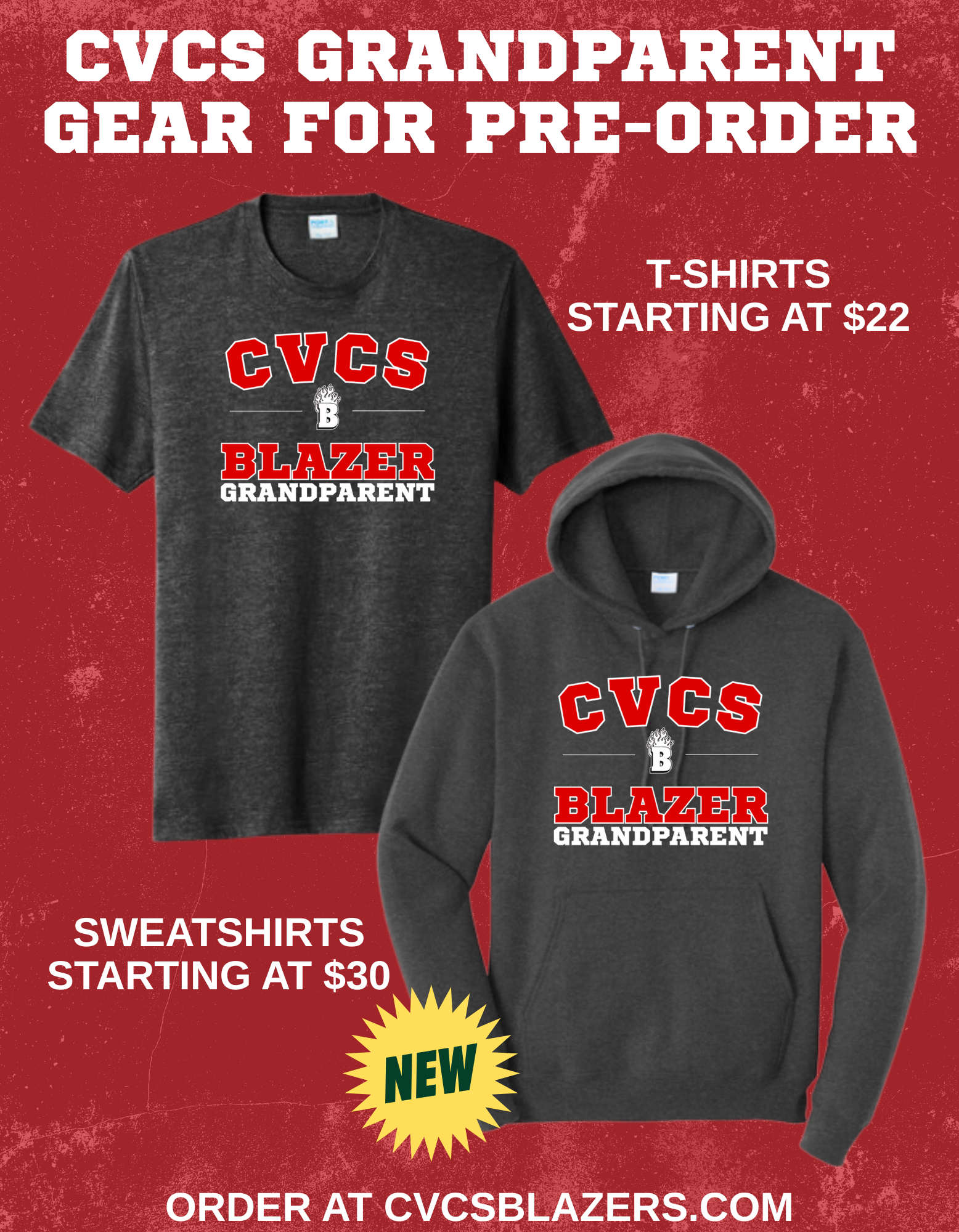 CVCS Grandparent t-shirts are back this year and brand new are CVCS Grandparent hoodie sweatshirts! Show your Blazer and grandparent pride in style. Items are available for pre-order and can be picked up at Grandparents Day.
